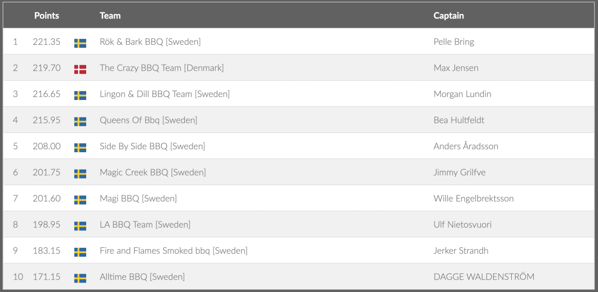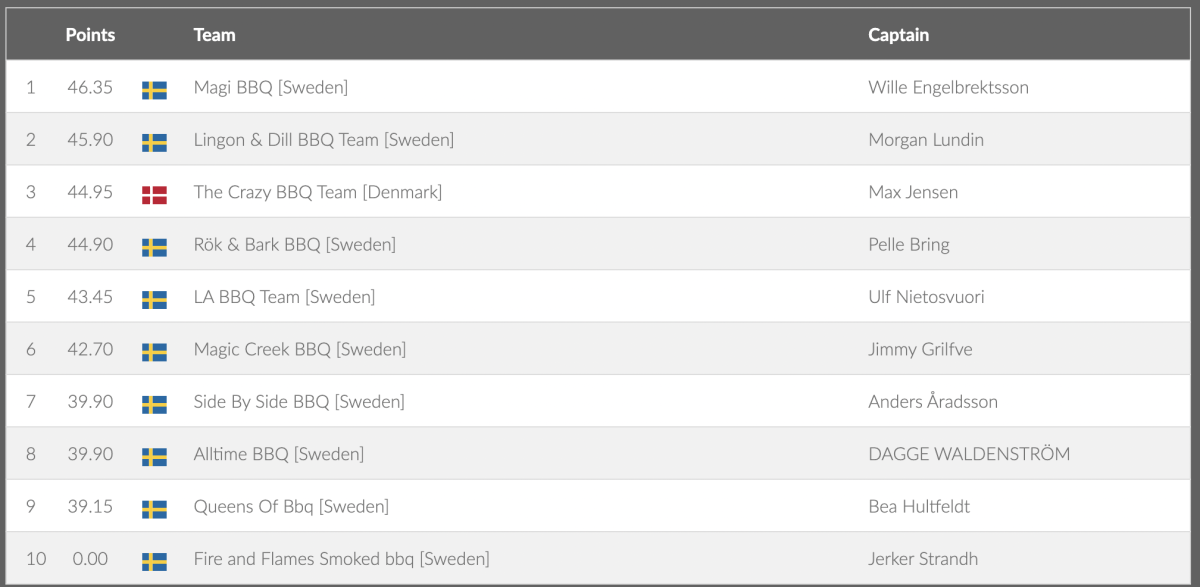 ![Lingon & Dill BBQ Team [Sweden] Morgan Lundin 2 46.70 SwedenQueens Of Bbq [Sweden] Bea Hultfeldt 3 44.35 SwedenSide By Side BBQ [Sweden] Anders Åradsson 4 44.10 SwedenLA BBQ Team [Sweden] Ulf Nietosvuori 5 42.75 SwedenAlltime BBQ [Sweden] DAGGE WALDENSTRÖM 6 42.00 DenmarkThe Crazy BBQ Team [Denmark] Max Jensen 7 41.55 SwedenMagic Creek BBQ [Sweden] Jimmy Grilfve 8 41.05 SwedenRök & Bark BBQ [Sweden] Pelle Bring 9 40.60 SwedenMagi BBQ [Sweden] Wille Engelbrektsson 10 37.35 SwedenFire and Flames Smoked bbq [Sweden]](/images/grill_sm/2022/Kyckling.png)