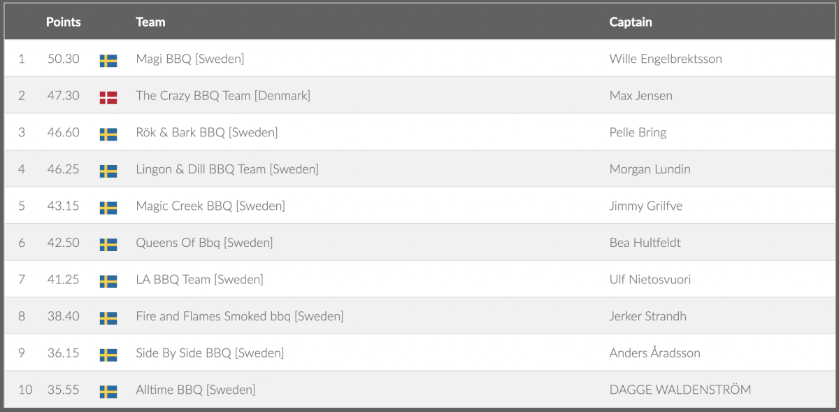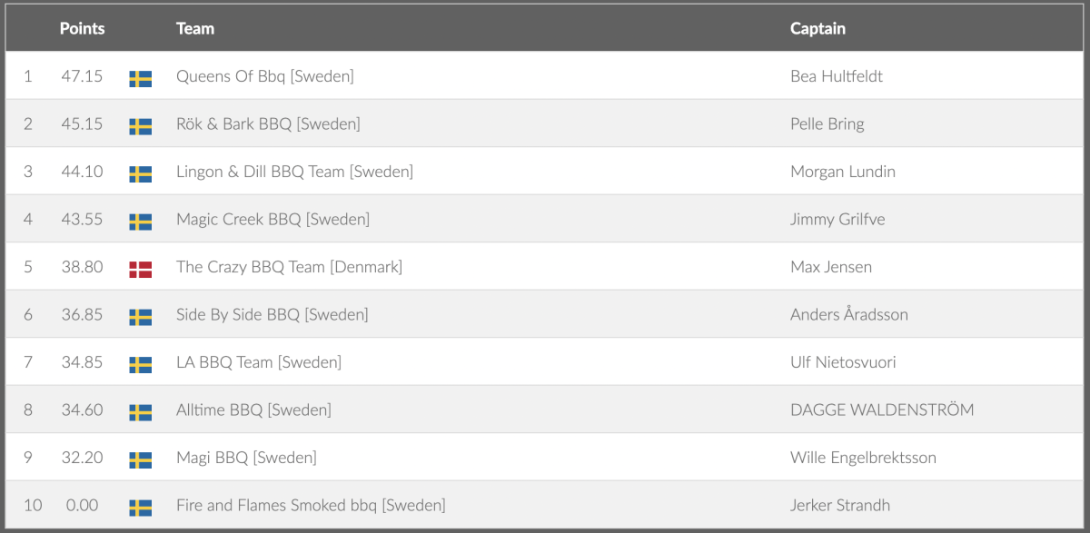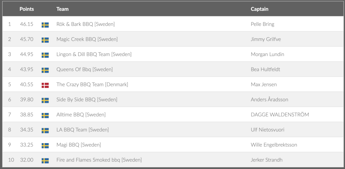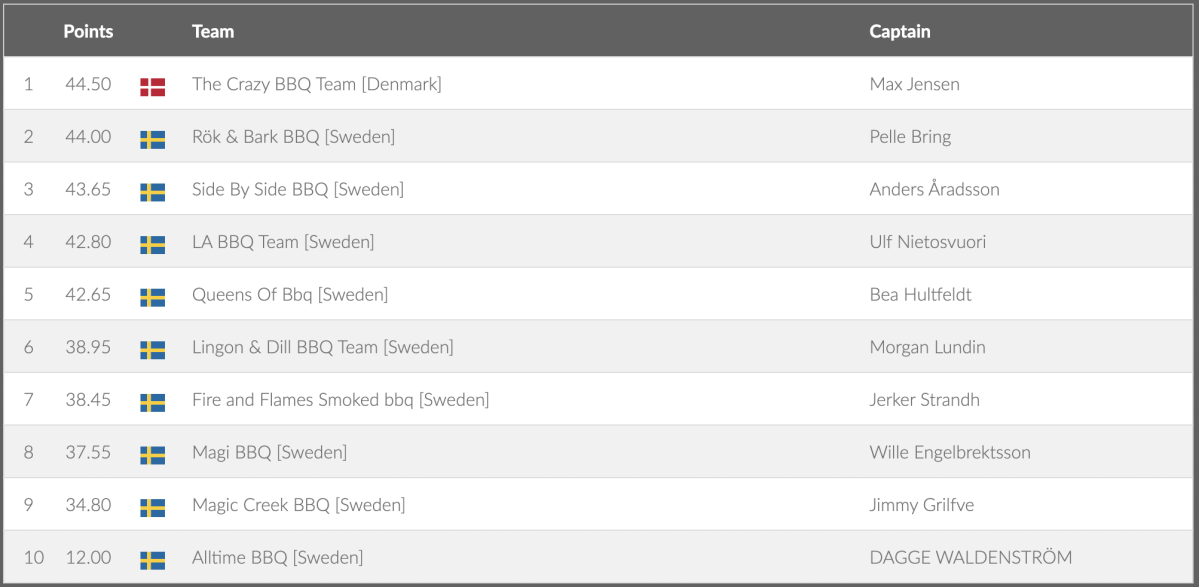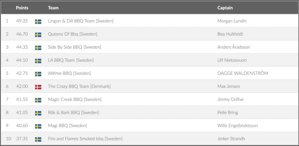 ![Rök & Bark BBQ [Sweden] Pelle Bring 2 45.70 SwedenMagic Creek BBQ [Sweden] Jimmy Grilfve 3 44.95 SwedenLingon & Dill BBQ Team [Sweden] Morgan Lundin 4 43.95 SwedenQueens Of Bbq [Sweden] Bea Hultfeldt 5 40.55 DenmarkThe Crazy BBQ Team [Denmark] Max Jensen 6 39.80 SwedenSide By Side BBQ [Sweden] Anders Åradsson 7 38.85 SwedenAlltime BBQ [Sweden] DAGGE WALDENSTRÖM 8 34.35 SwedenLA BBQ Team [Sweden] Ulf Nietosvuori 9 33.25 SwedenMagi BBQ [Sweden] Wille Engelbrektsson 10 32.00 SwedenFire and Flames Smoked bbq [Sweden]](/images/grill_sm/2022/Grisbog.png)