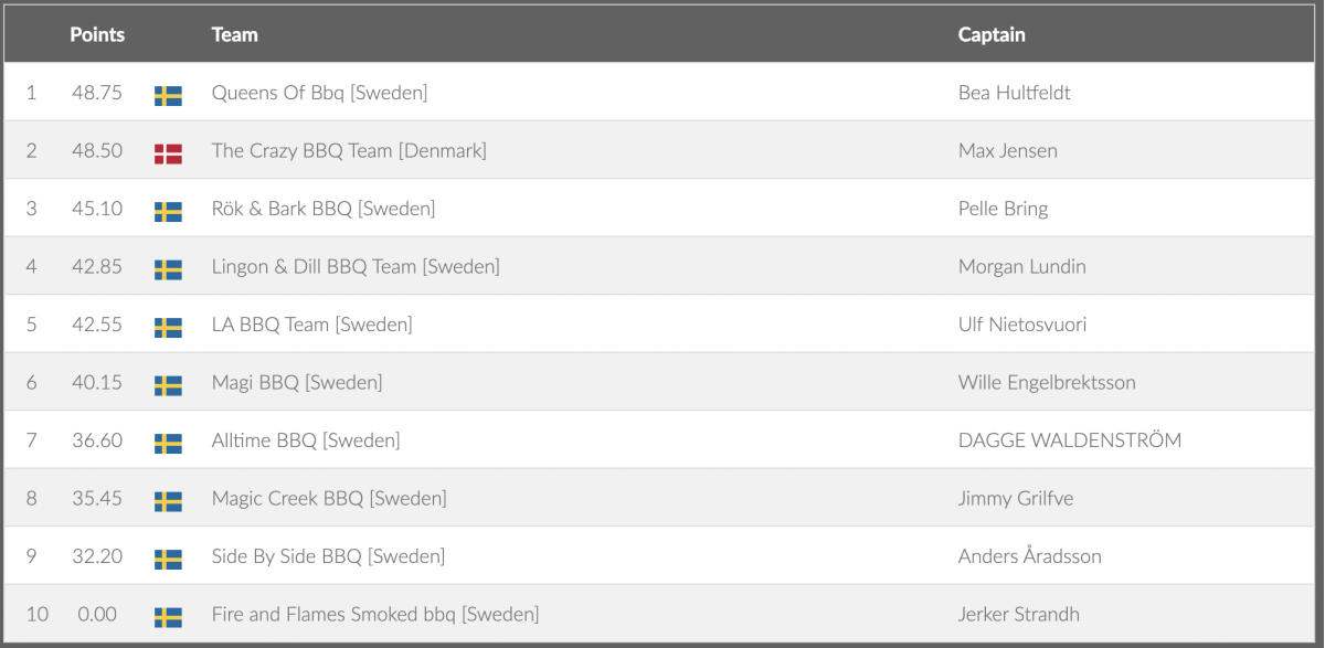 ![Queens Of Bbq [Sweden] Bea Hultfeldt 2 48.50 DenmarkThe Crazy BBQ Team [Denmark] Max Jensen 3 45.10 SwedenRök & Bark BBQ [Sweden] Pelle Bring 4 42.85 SwedenLingon & Dill BBQ Team [Sweden] Morgan Lundin 5 42.55 SwedenLA BBQ Team [Sweden] Ulf Nietosvuori 6 40.15 SwedenMagi BBQ [Sweden] Wille Engelbrektsson 7 36.60 SwedenAlltime BBQ [Sweden] DAGGE WALDENSTRÖM 8 35.45 SwedenMagic Creek BBQ [Sweden] Jimmy Grilfve 9 32.20 SwedenSide By Side BBQ [Sweden] Anders Åradsson 10 0.00 SwedenFire and Flames Smoked bbq [Sweden]](/images/grill_sm/2022/Dessert.png)