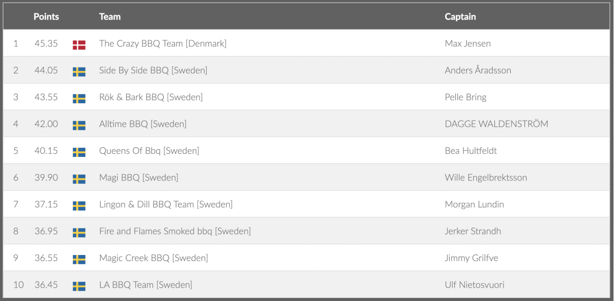 ![Rök & Bark BBQ [Sweden] Pelle Bring 2 45.70 SwedenMagic Creek BBQ [Sweden] Jimmy Grilfve 3 44.95 SwedenLingon & Dill BBQ Team [Sweden] Morgan Lundin 4 43.95 SwedenQueens Of Bbq [Sweden] Bea Hultfeldt 5 40.55 DenmarkThe Crazy BBQ Team [Denmark] Max Jensen 6 39.80 SwedenSide By Side BBQ [Sweden] Anders Åradsson 7 38.85 SwedenAlltime BBQ [Sweden] DAGGE WALDENSTRÖM 8 34.35 SwedenLA BBQ Team [Sweden] Ulf Nietosvuori 9 33.25 SwedenMagi BBQ [Sweden] Wille Engelbrektsson 10 32.00 SwedenFire and Flames Smoked bbq [Sweden]](/images/grill_sm/2022/Grisbog.png)