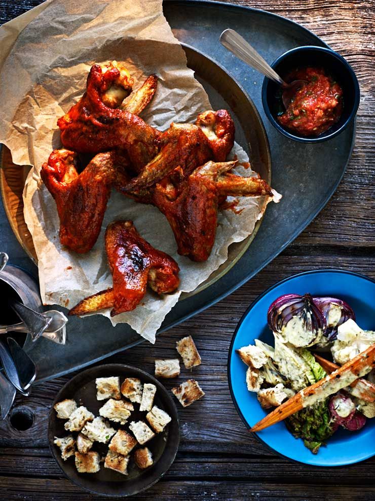 Grillade kycklingvingar, caesarsallad, parmesandressing och salsa