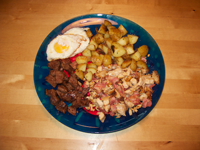 Började med att bryna bacon, slängde kyckling som jag hade skurit i mindre bitar. Ett trevlig giftemål inträffade i pannan. Lite BBQ krydda på det från kvarnen. Flap steaken blev också uppskuren i mindre bitar. Stekt med olja och svart peppar. Potatisen fick lite ny olivolja och salt nere i pannan. Allt upplagt i ett trevligt fat.
