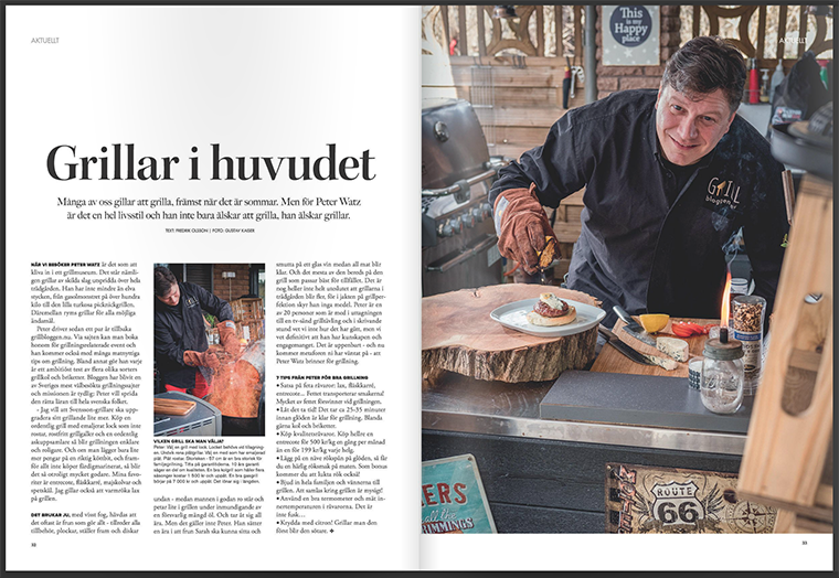 "När vi besöker Peter Watz är det som att kliva in i ett grillmuseum. Det står grillar av skilda slag utspridda över hela trädgården. Han har inte mindre än elva stycken, från gasolmonstret på över hundra kilo ner till den lilla turkosa picknickgrillen. Däremellan ryms grillar för alla möjliga ändamål..."